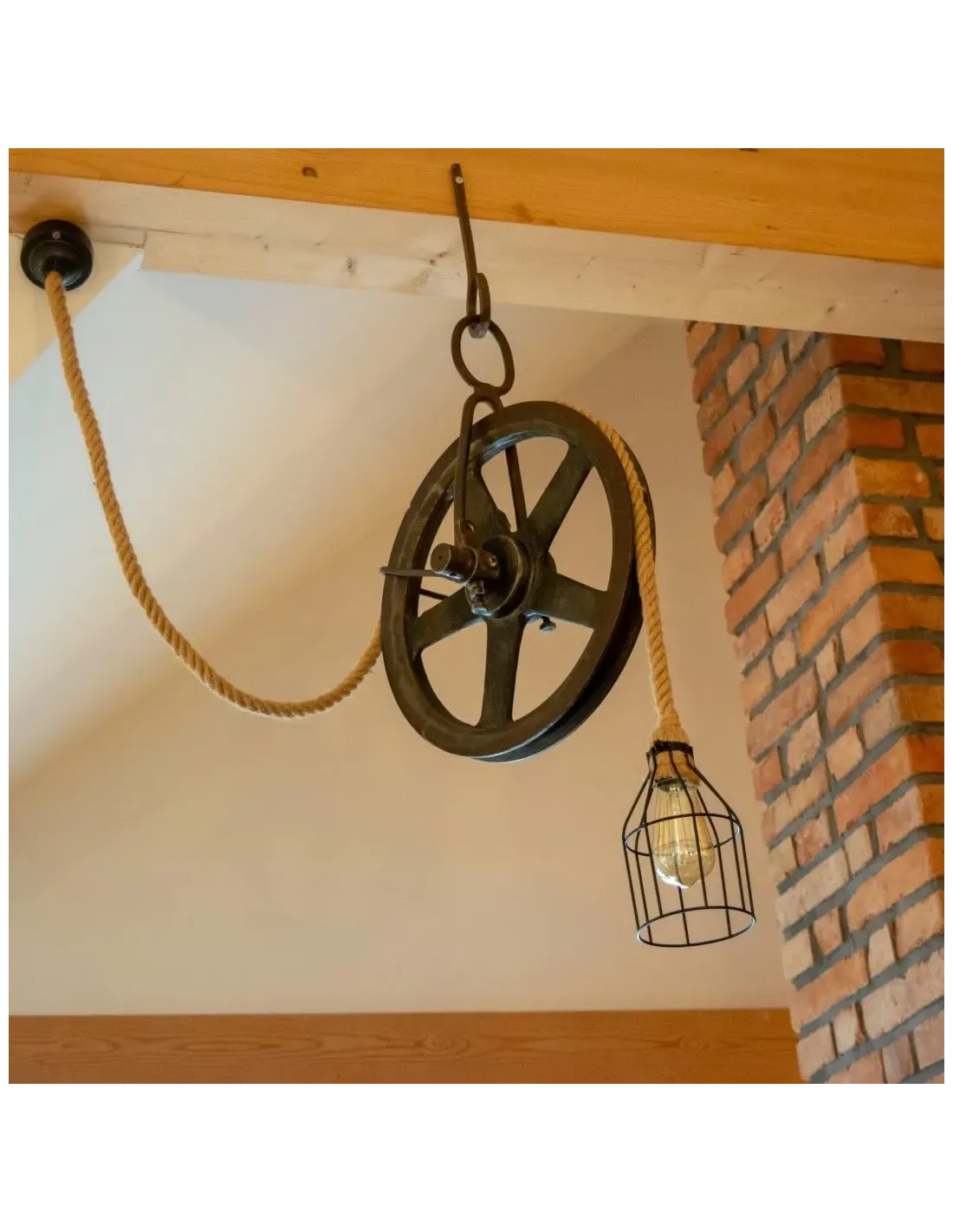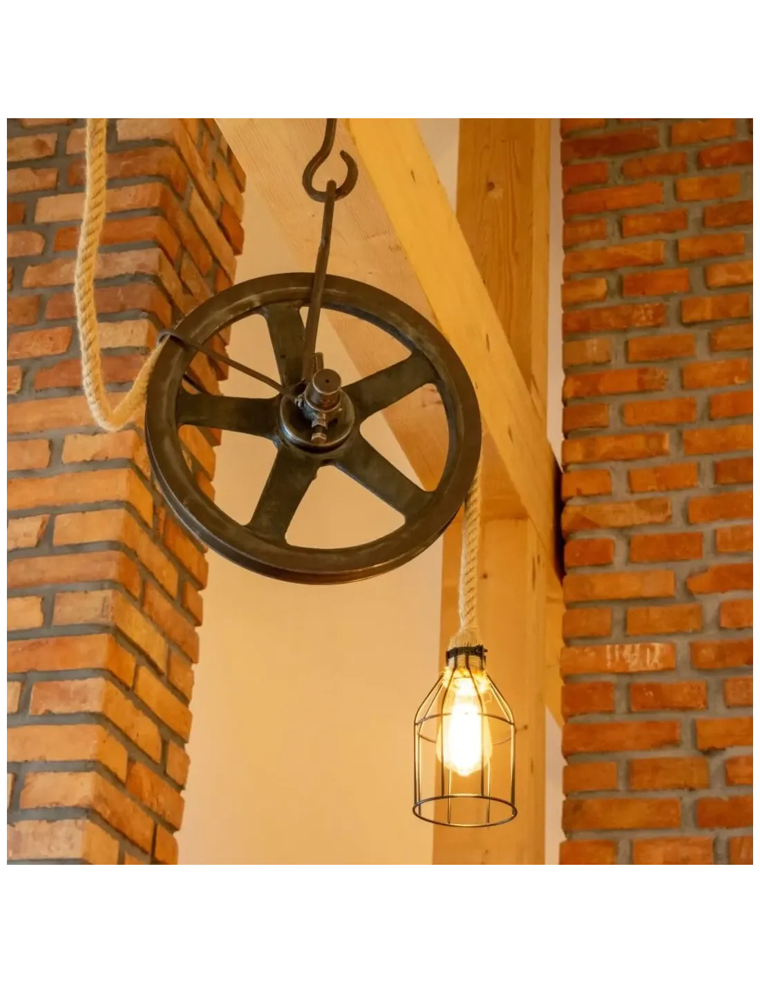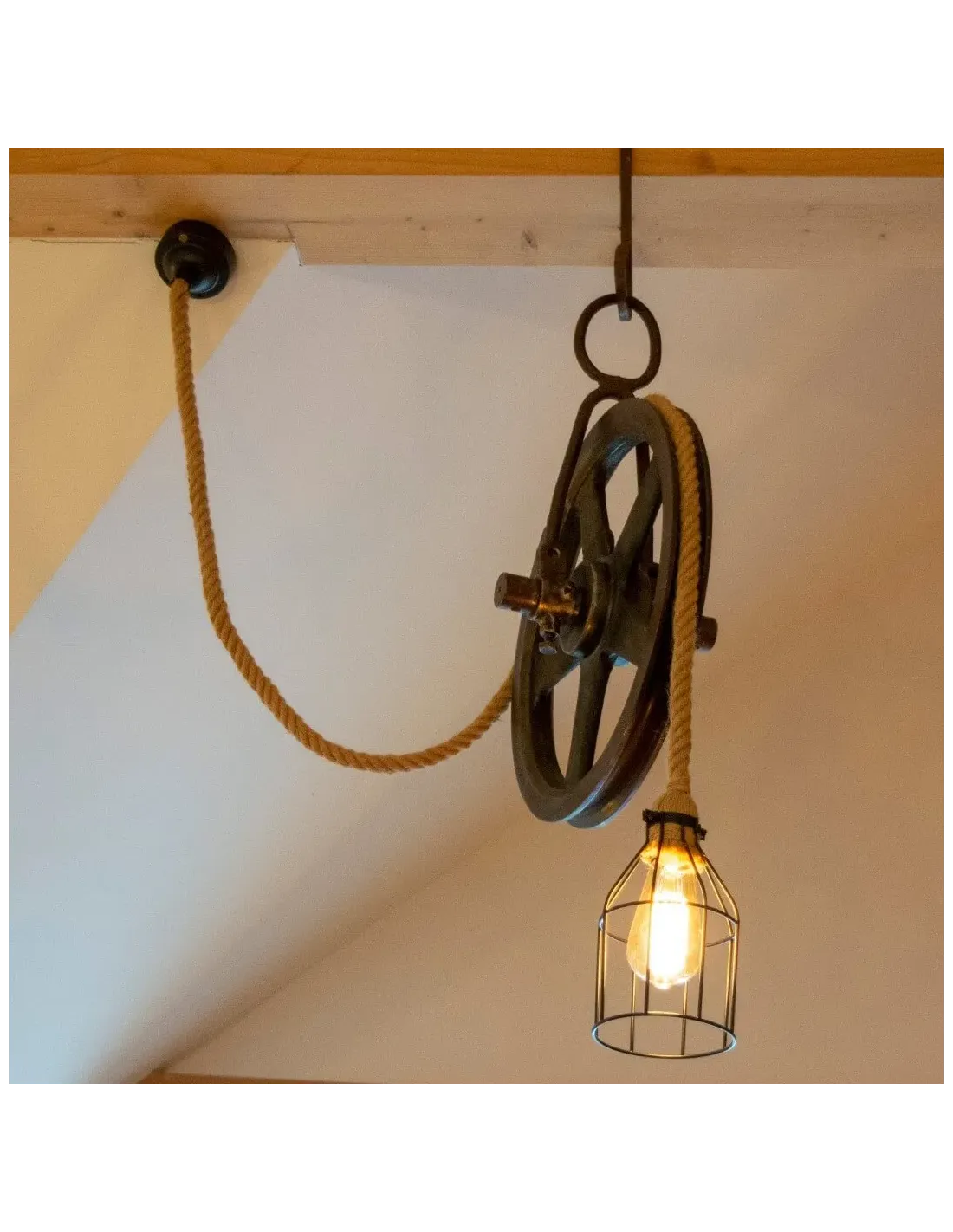 Once a functional tool of the past, the pulley has been given new life as a striking lighting fixture, paired with natural rope and a warm Edison bulb for authentic vintage charm.