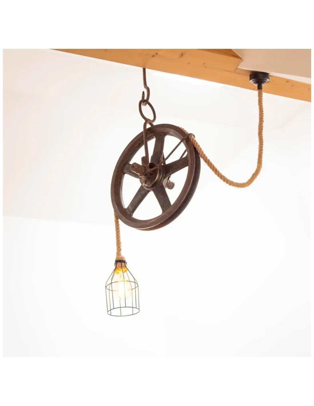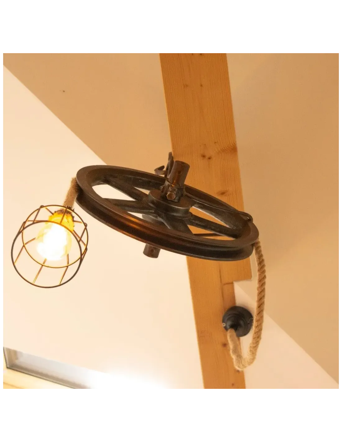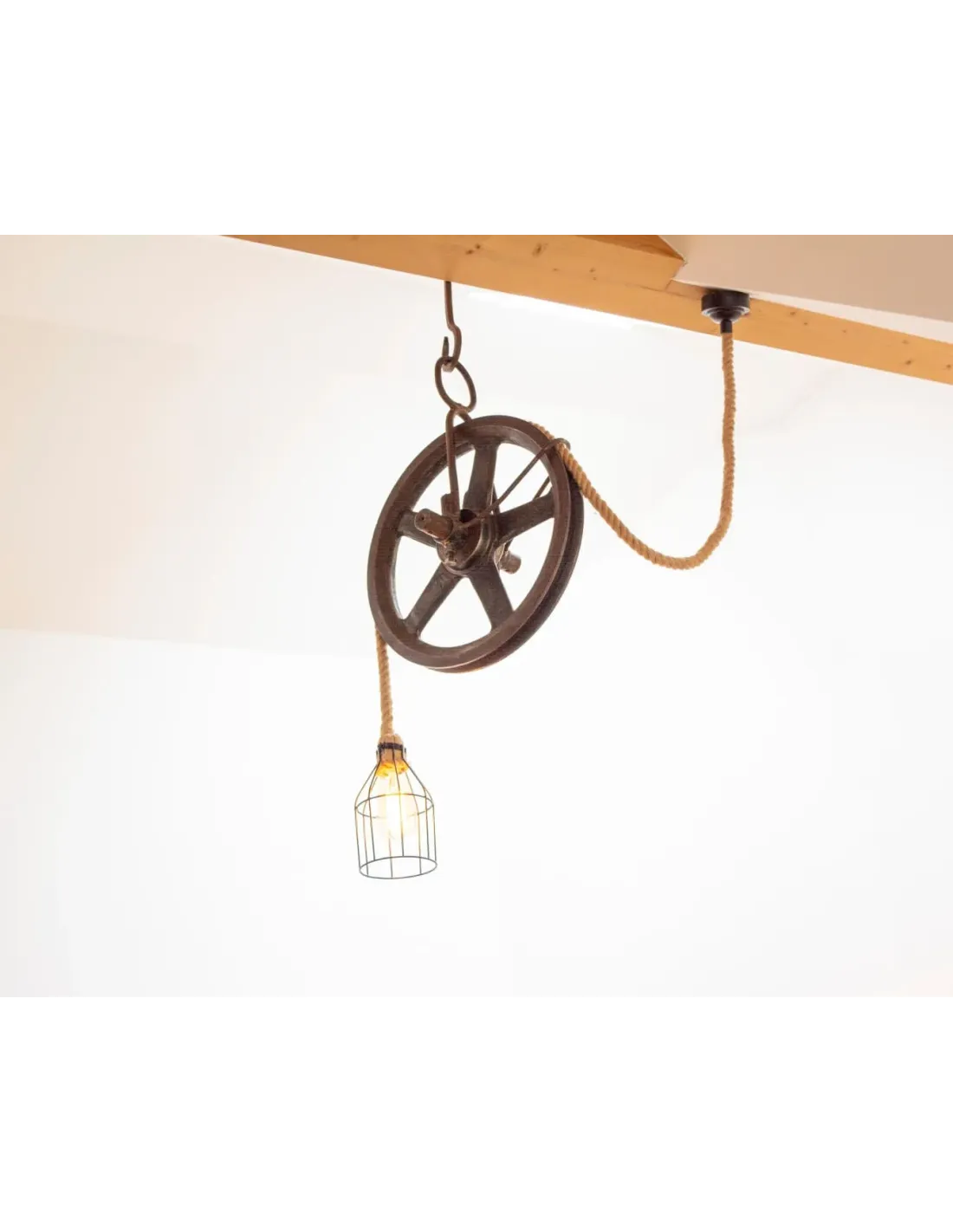 Once a functional tool of the past, the pulley has been given new life as a striking lighting fixture, paired with natural rope and a warm Edison bulb for authentic vintage charm.